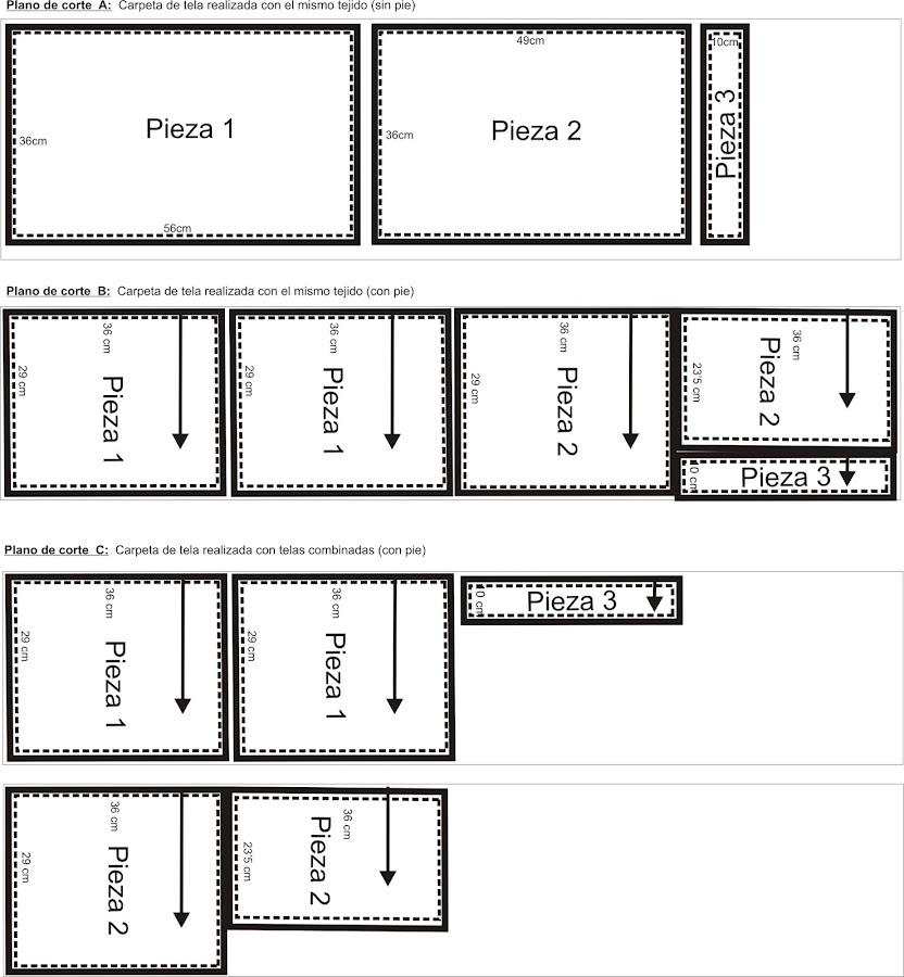 - Con pie sin combinar, Plano de Corte B: 35 x 150 cm (o el ancho de la tela)