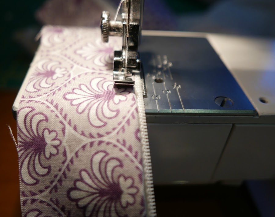 12. Cuando cosamos los laterales, en la zona donde irá el bolsillo interior de la cremallera, doblaremos cada lado del forro al que corresponde colocarla, iremos doblando 0’5 cm hacia adentro, para que esa zona quede preparada para unirse a la carpeta.