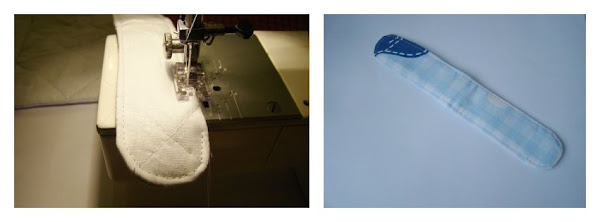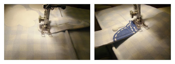 12. Hacemos la pieza interior, primero pasamos el pespunte divisorio y después ponemos los snaps, según indica el patrón: