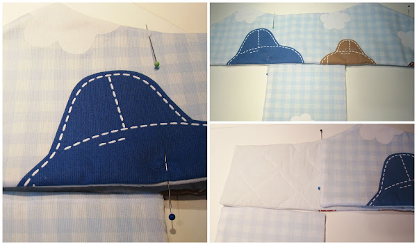 1. Primero comenzaremos cortando las piezas como indica el patrón y las uniremos con alfileres al forro guateado: