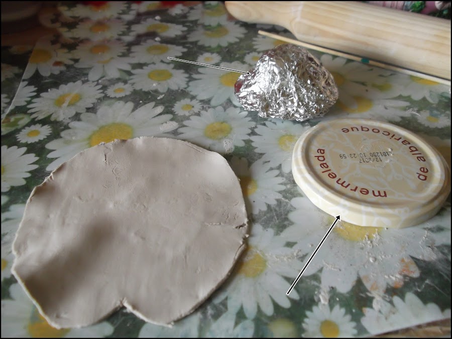 Con la ayuda de papel de aluminio hice una especie de cucurucho y lo pegué sobre la tapa del bote con cola blanca, luego lo forre con la pasta de modelar.