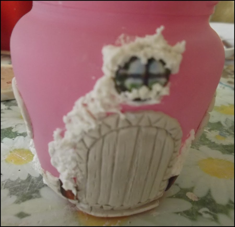 Hice la puerta, el quicio de la misma, un escalón, algunos ladrillos que coloque a los lados de la puerta, unas macetas y un ventanal redondo encima de la puerta.