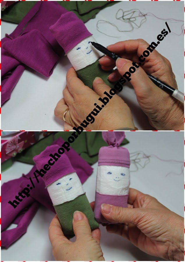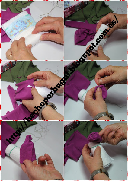 Si quieres hacer un regalo mas completo puedes tomar ésta idea y cambiar los trozos de tela de camiseta por calcetines para lo que sería la cabeza y otra ropa de bebe, tipo camisetas o bodys para el cuerpo.