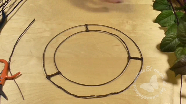 Para hacer esta corona crearemos una base con alambres de diferentes tamaños. Utilizaremos un alambre más grueso para formar dos aros, uno exterior u otro interior. Los alambres más finos los usaremos para ir uniendo las dos partes formando una pieza sobre la que iremos colocando las ramas.