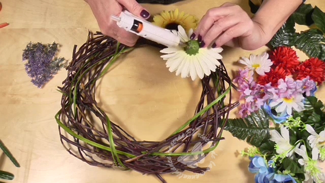 Una vez tengamos creada la base de la corona con todas las ramas alrededor de la base de alambres con la cantidad de ramas que consideremos adecuada, procederemos a adornarla con flores de papel, tela o incluso naturales, dependiendo de la duración que deseemos para nuestra corona. Nos ayudaremos de la silicona caliente para sujetar los diferentes elementos de decoración.