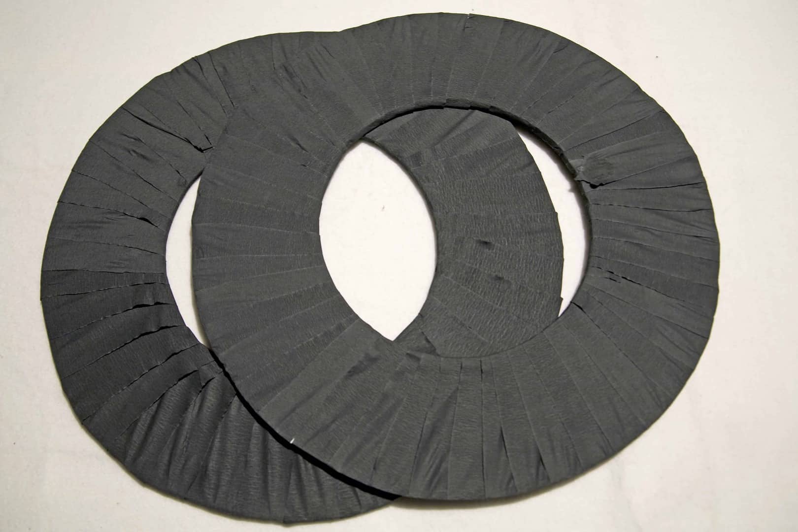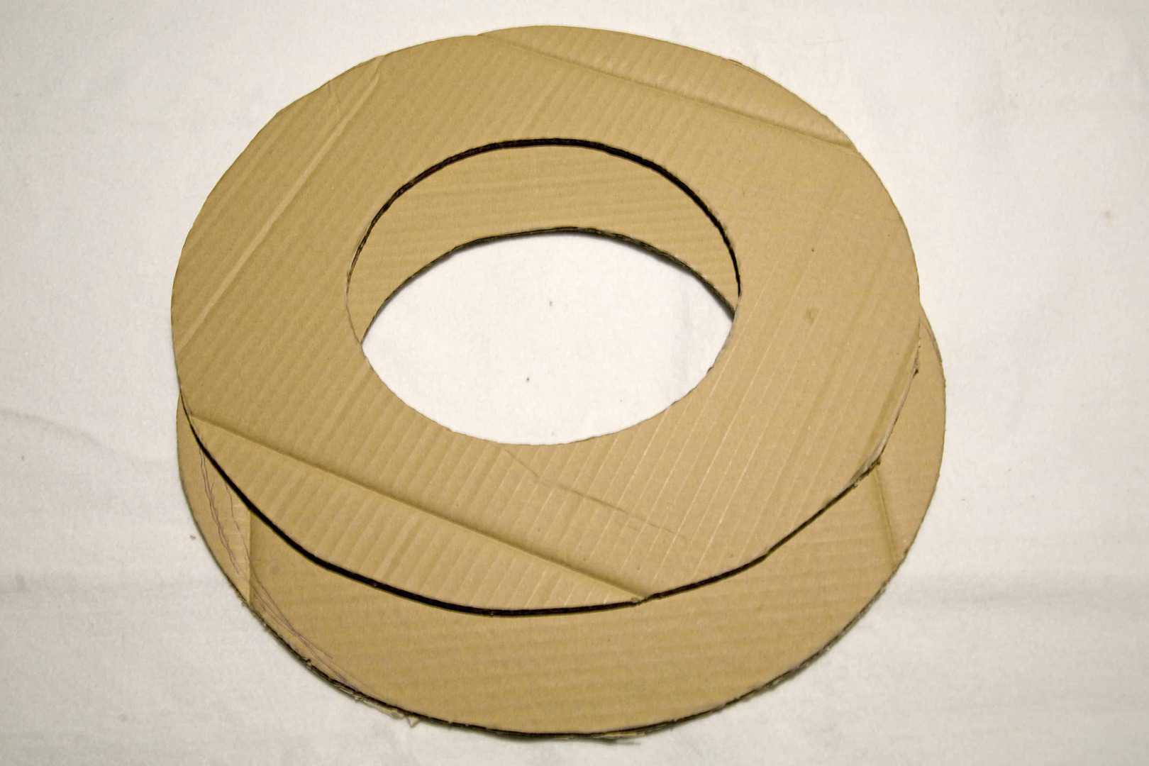La base de esta corona de halloween son dos círculos de cartón de 40 centímetros de diámetro. Yo he utilizado dos porque el cartón no era muy consistente, pero si tienes un cartón los suficientemente duro puedes utilizar sólo un círculo.
