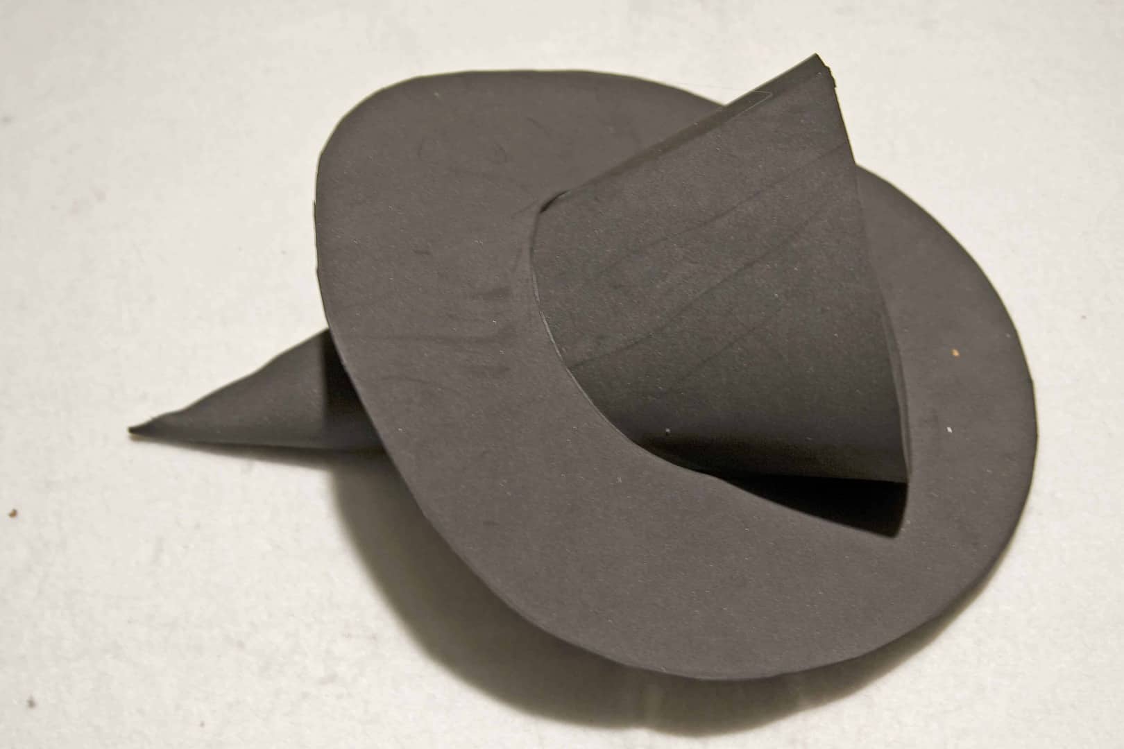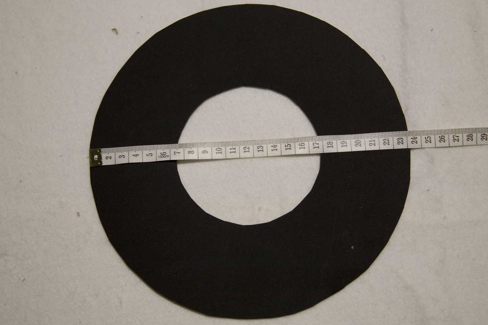 Para confeccionar el ala del gorro de bruja de la corona de Halloween recortamos un círculo en goma eva de color negro de 23 cm de diámetro. El ancho del ala es de 6,5 cm.