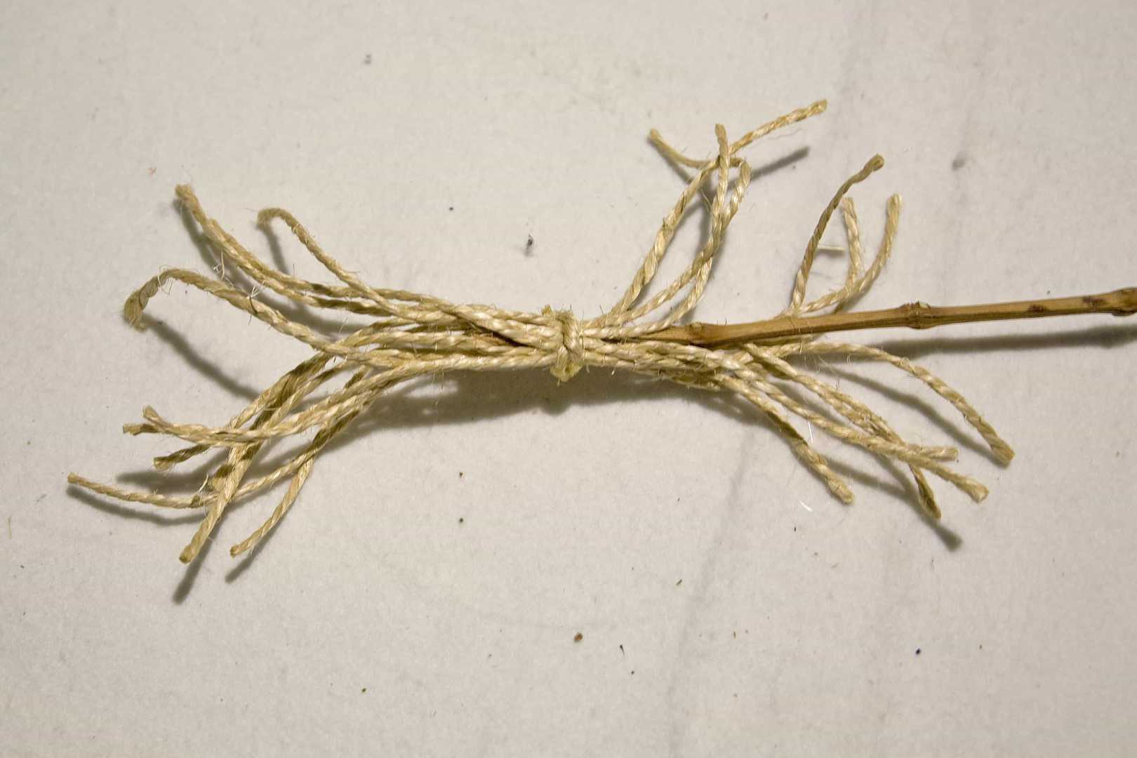 Doblamos los trozos de cuerda sobre el atado que hemos hecho colocando todos los extremos de las cuerdas en el mismo sentido. Con un trozo de cordel más fino atamos de nuevo.