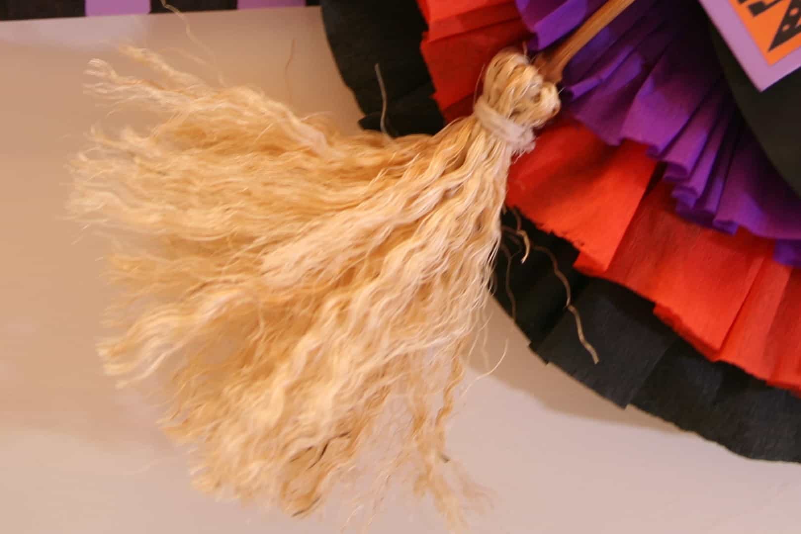 Para finalizar la corona de halloween pegamos las medias con las botas por la parte de atrás, y la escoba, el gorro y el cartel, por este orden, por la parte delantera de la corona.