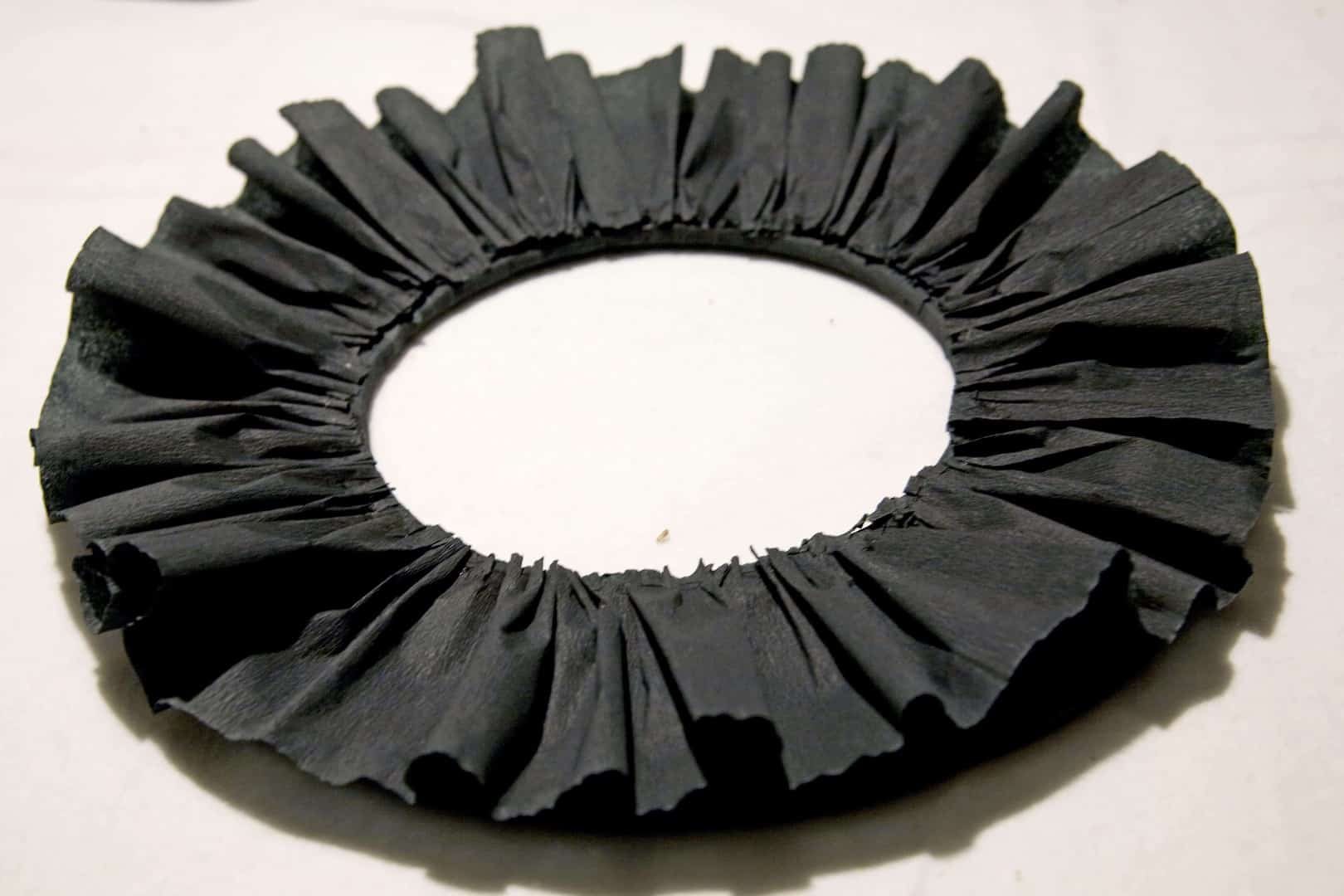 Hilvanamos con cuidado de no romper el papel y fruncimos para formar un volante que pegamos sobre la corona con la pistola de silicona caliente.