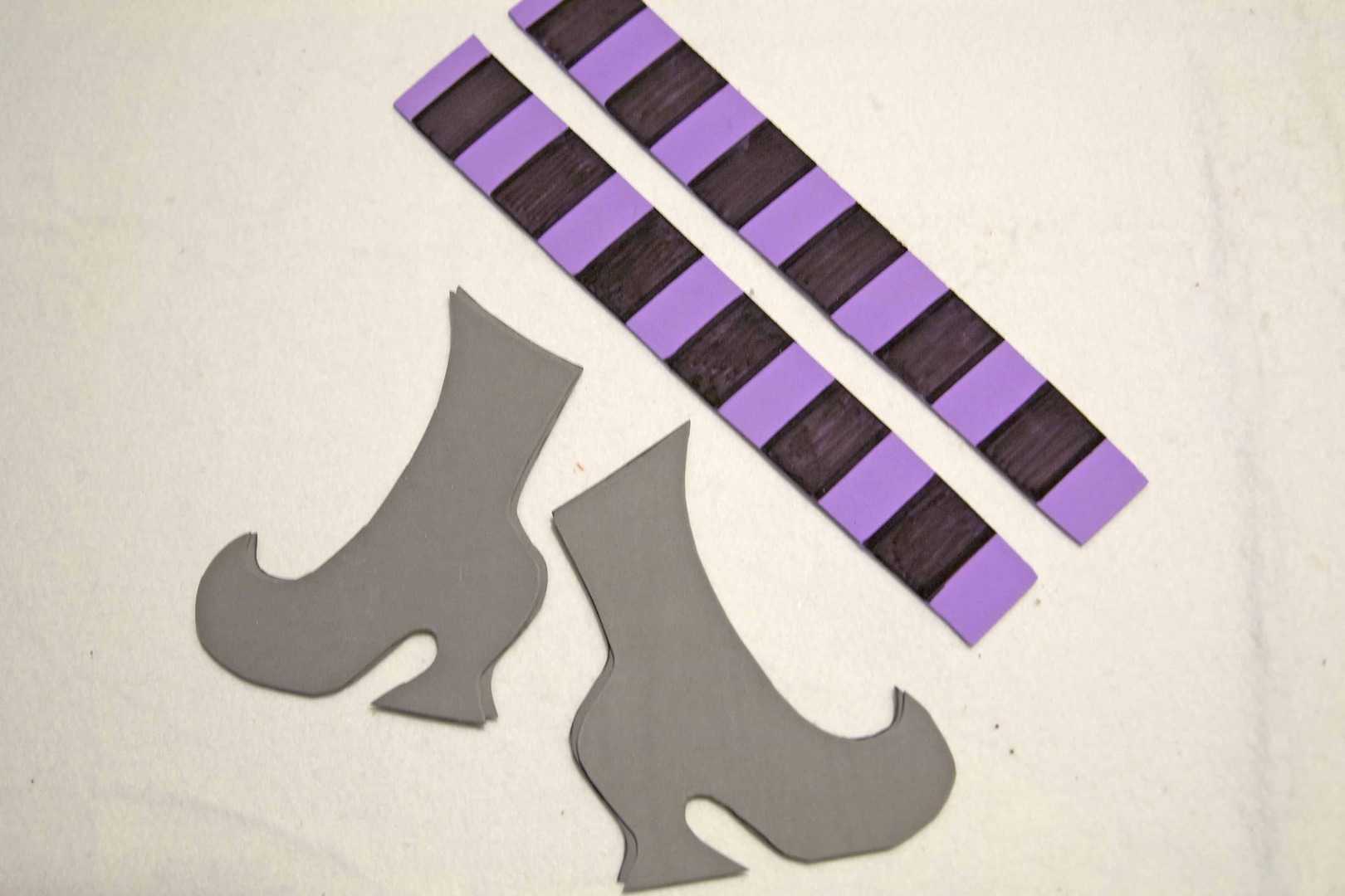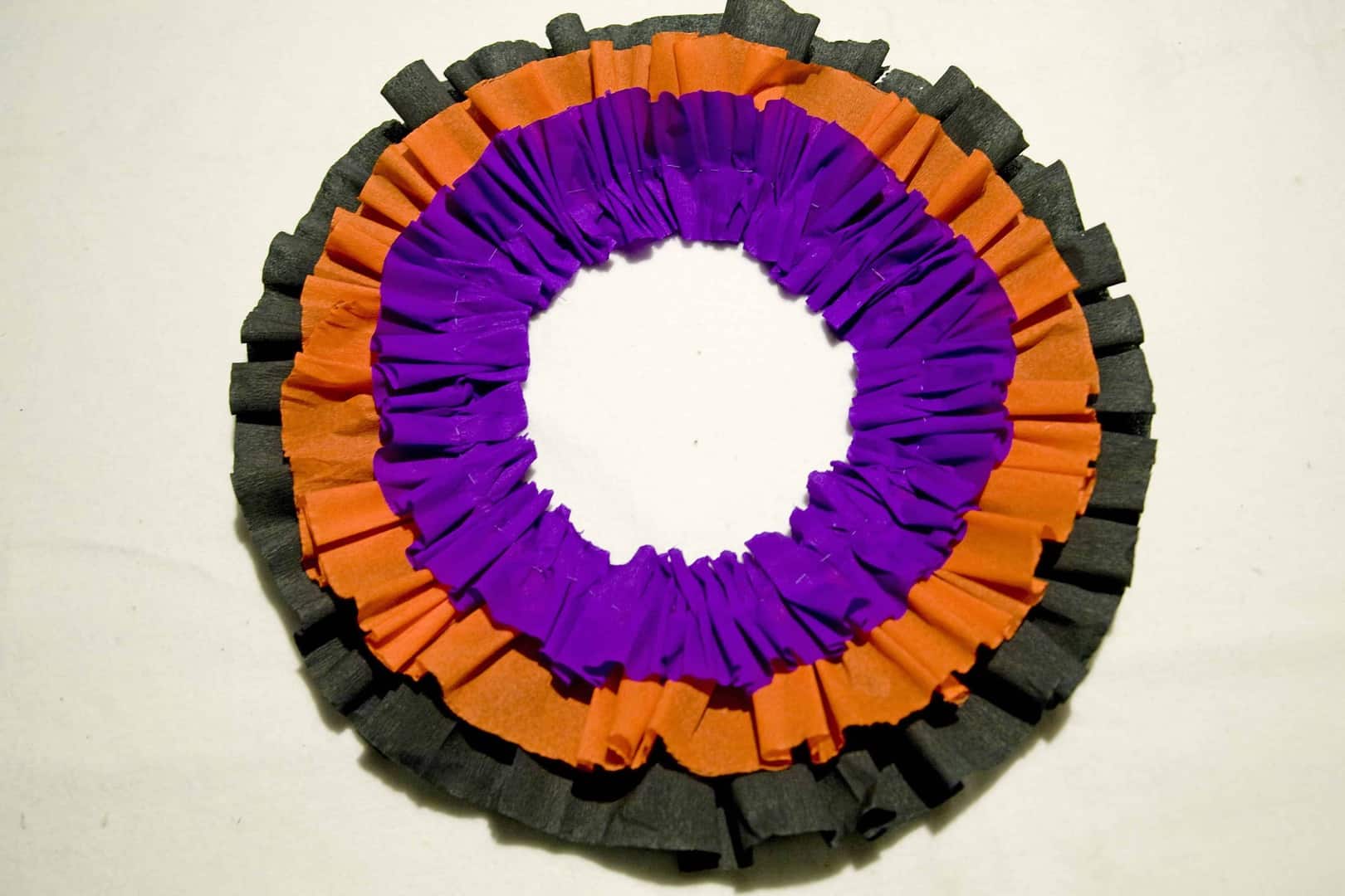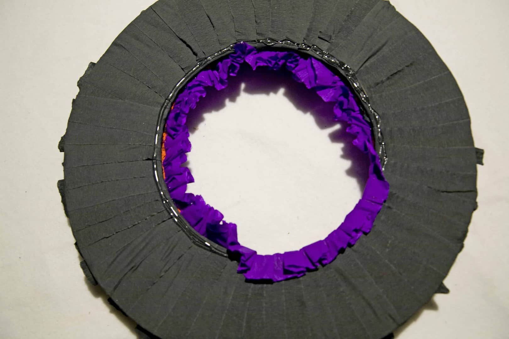 Damos la vuelta a la corona de Halloween y pegamos el papel pinocho que sobresale por la parte de atrás. Cortamos dos tiras de goma eva de color morado y con un rotulador permanente de color negro pintamos las rayas de las medias.