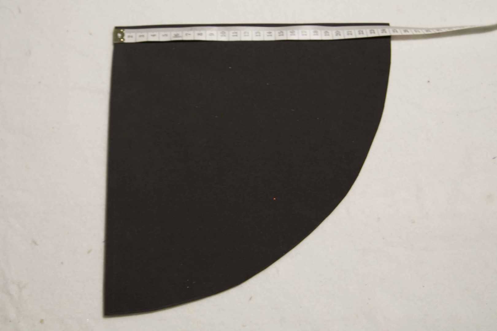 El pico del gorro tiene un alto de 24 cm. Cortamos una pieza como la de la fotografía y pegamos entre sí los dos lados rectos para formar un cono.