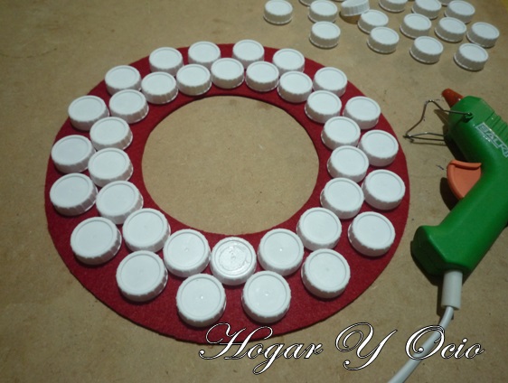 1. Cortamos un aro de fieltro teniendo en cuenta las dimensiones que queremos para la corona y el espacio que ocuparán los tapones.