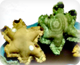 Con un hilo que contraste con las telas y que le vayan bien al conjunto del trabajo paso un hilván por la marca de la estrella dejando un hueco al final para meter la fibra sintética, acomodo en las esquinas la fibra para darle la forma y cuando considero que está lista , la cierro y remato .