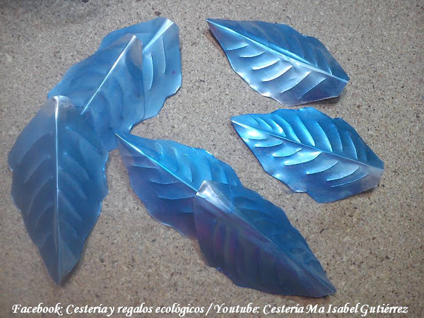 La flor está formado por diez pétalos, primero hacemos un molde con papel, recortando una hoja alargada y con algunas ondas a los lados como se aprecia en la primera imagen... En base a este molde, cortamos los pétalos en el aluminio, doblamos a la mitad remarcando la línea, luego, con un bolígrafo de punta dura, dibujaremos, por la parte coloreada del aluminio, pequeñas rayas a los lados de la línea central, como si fuesen nervaduras de las hojas...