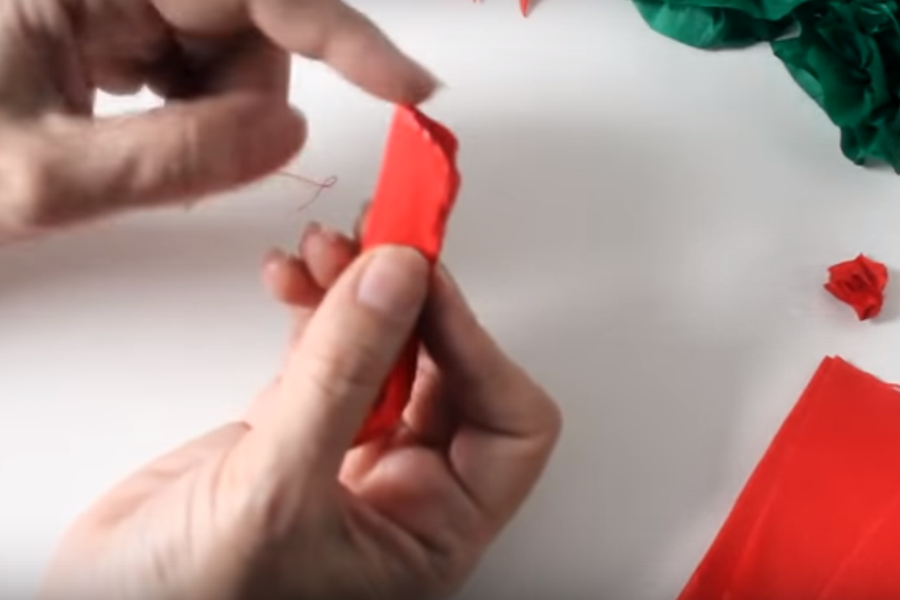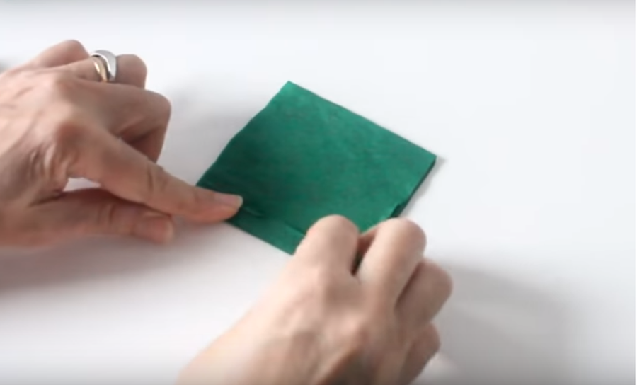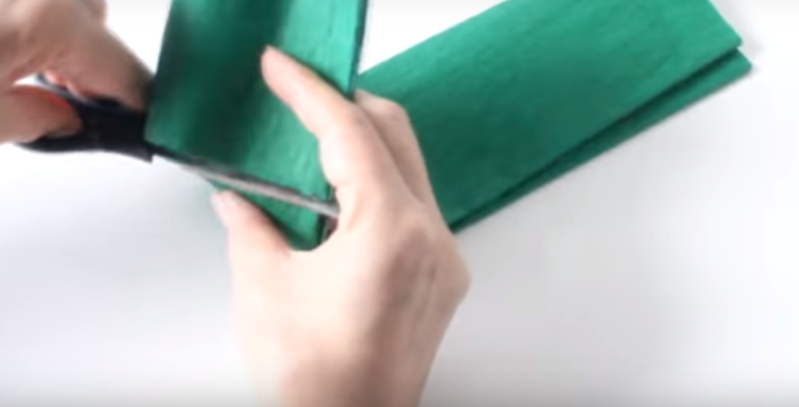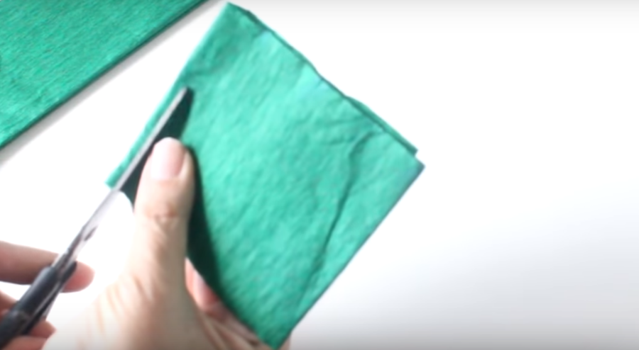 Lo primero que tenemos que hacer es doblar uno de los extremos del papel crepe verde de tal manera que logremos formar un cuadrado...