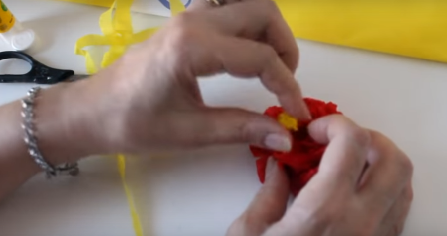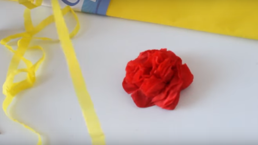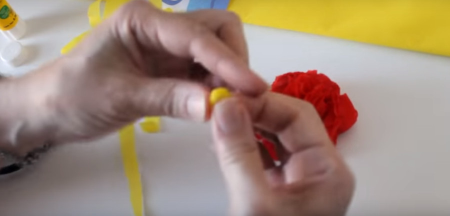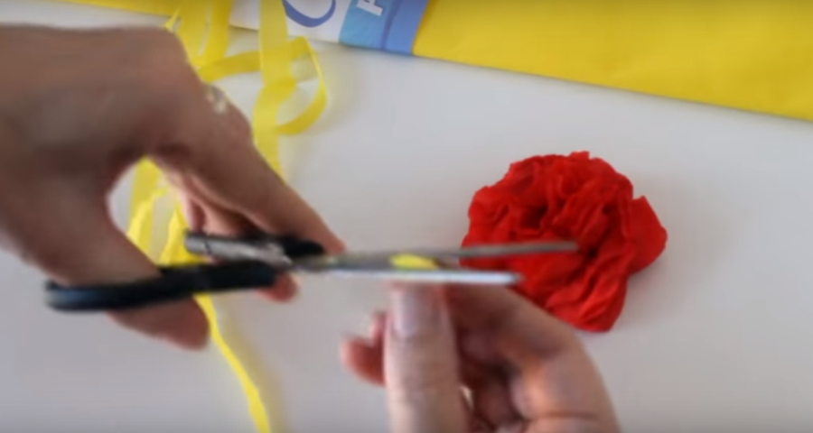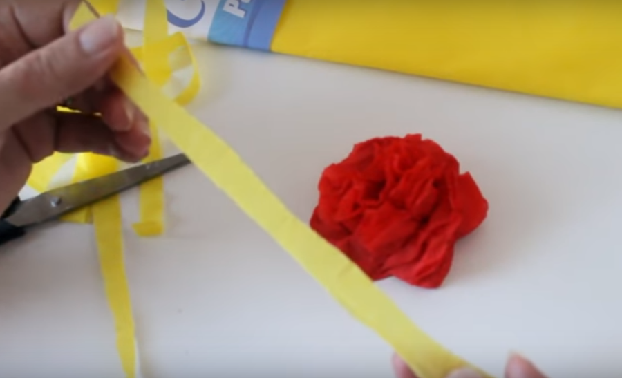 ...para el centro de la flor vamos a cortar una tira de papel crepe amarillo...