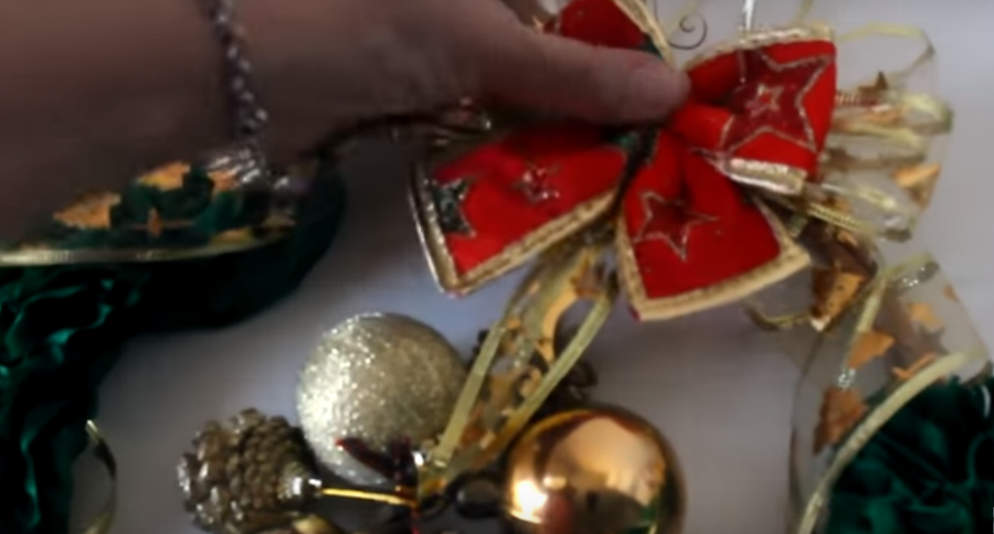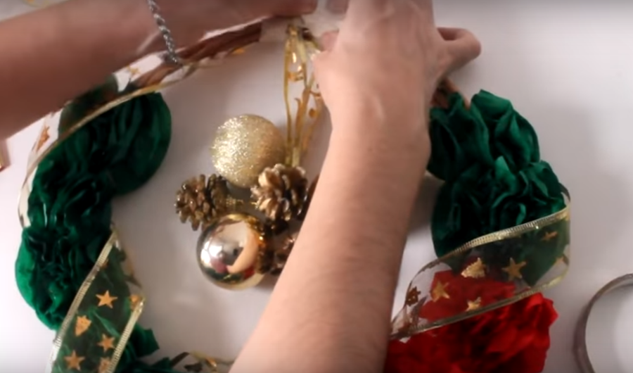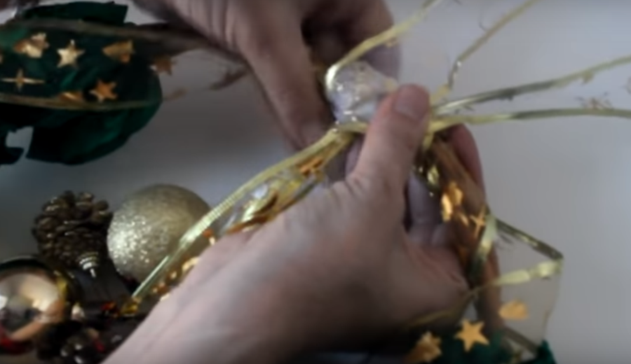 ...con otro trozo de cinta navideña vamos a formar un lazo en ese mismo lugar y vamos a asegurar todo con cinta adhesiva o de papel...