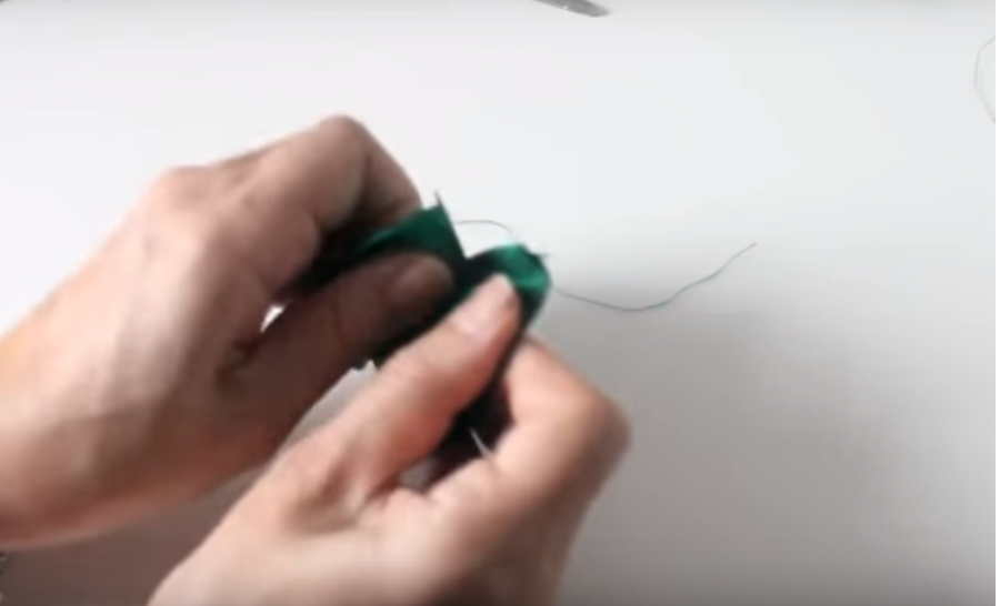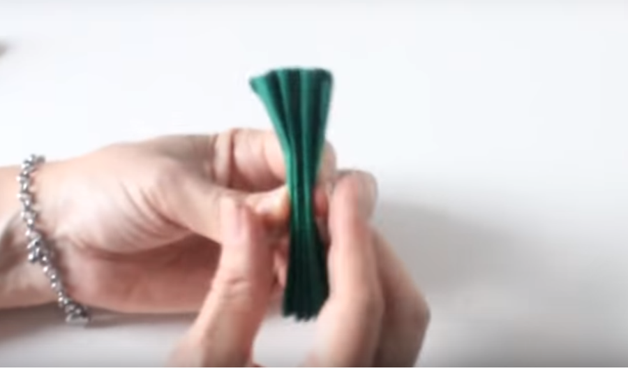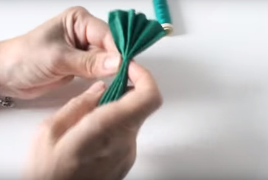 ...y luego vamos a enrollar el hilo de coser verde por el centro del acordeón y después de varias vueltas vamos a atar un nudo...