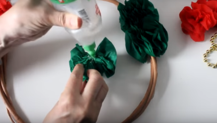 ... ahora podemos comenzar a armar la corona pegando cada uno de los pompones que hemos armado...