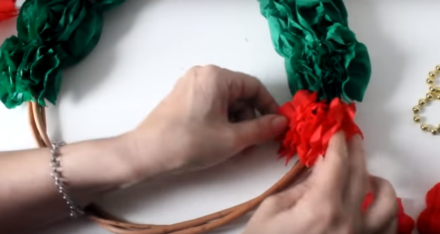 ...vamos colocando los pompones verdes dejando un espacio en la parte superior y luego a continuación de los verdes del lado derecho colocamos los rojos...