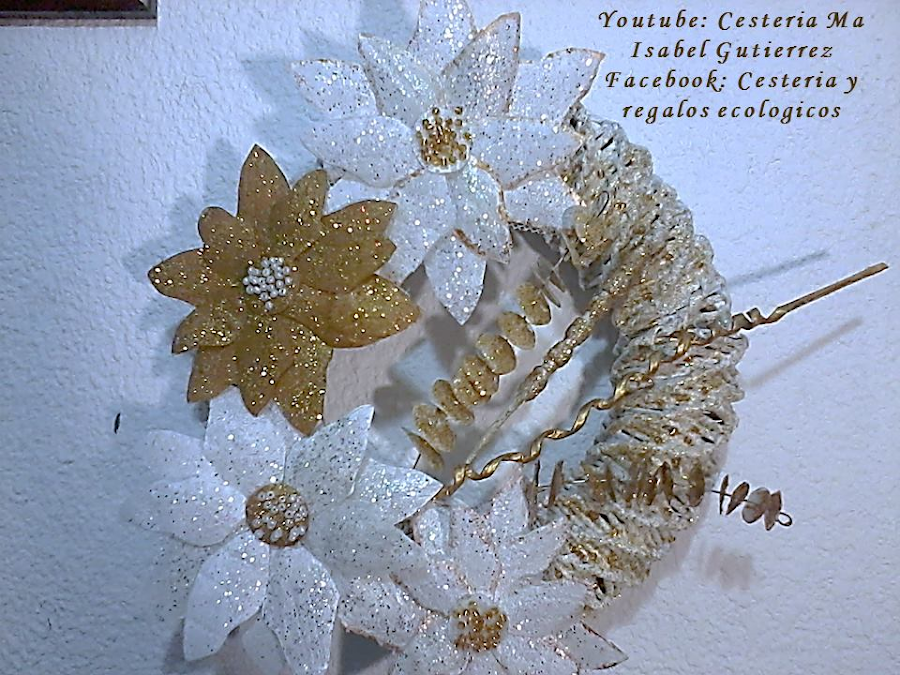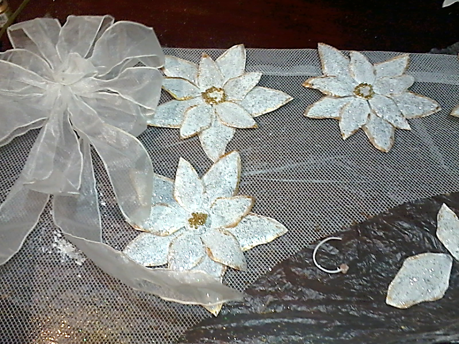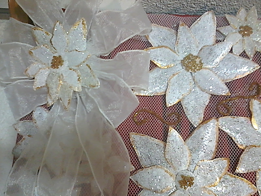 Pegamos una flor en el centro del lazo o moño, y empezamos a pegar las flores, distribuyendo flores grandes, medianas y pequeñas por toda la superficie del tul...