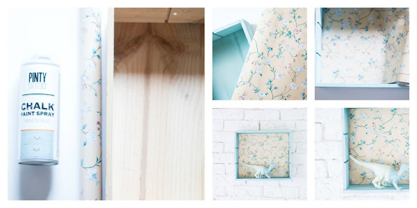 Necesitamos: Una caja de vino de madera, pintura, papel decorado adhesivo y tijeras. Yo use pintura chalk paint en spray de Novasol, que ya os he comentado por aquí y en Instagram que me encanta. Tengo pendiente hacerme con más colores y con algún tipo de barniz mate.