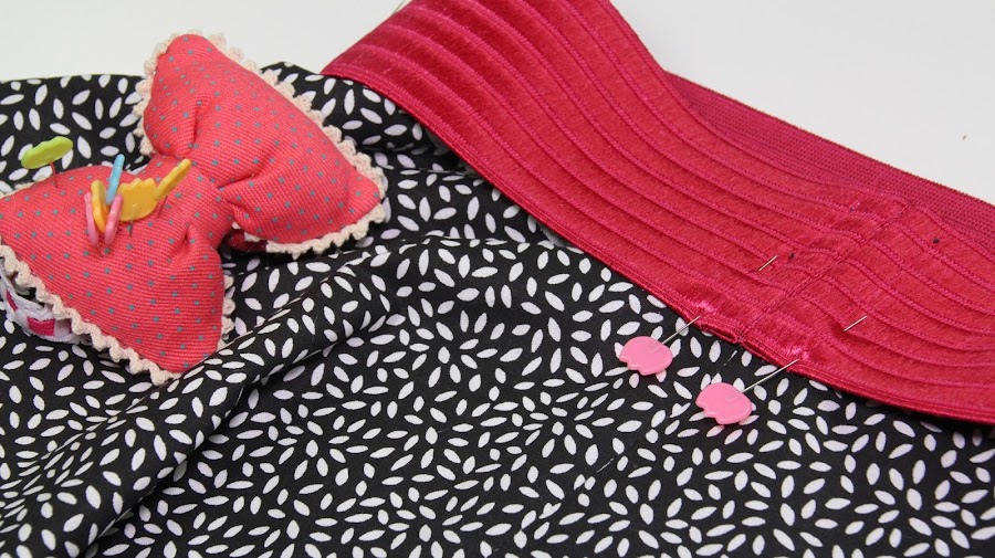 Para la cintura me he ido a lo fácil y he optado por una banda elástica color fucsia de 6cm de ancho que encontré en una conocida mercería de Madrid. Esta opción, es ideal si tu peque piensa crecer. El año pasado le hice a Lucía una falda con cinturilla con tela y cremallera en la parte posterior y este año ya no le vale, ni desplazando el botón.
