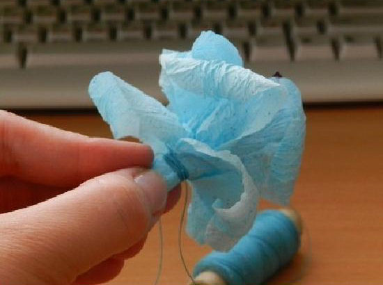 7) Ponemos mas pétalos rodeando las tiras, una vez que se ha formado una "flor", amarramos los pétalos de servilleta con el hilo.