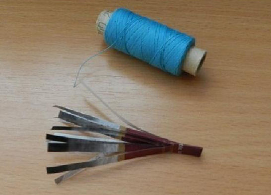 5) A una hoja de la revista, cortamos pequeñas tiras del mismo ancho (delgadas y finas) y de unos 6 o 7 cm de largo. Con el hilo, amarramos las tiras en un extremo.