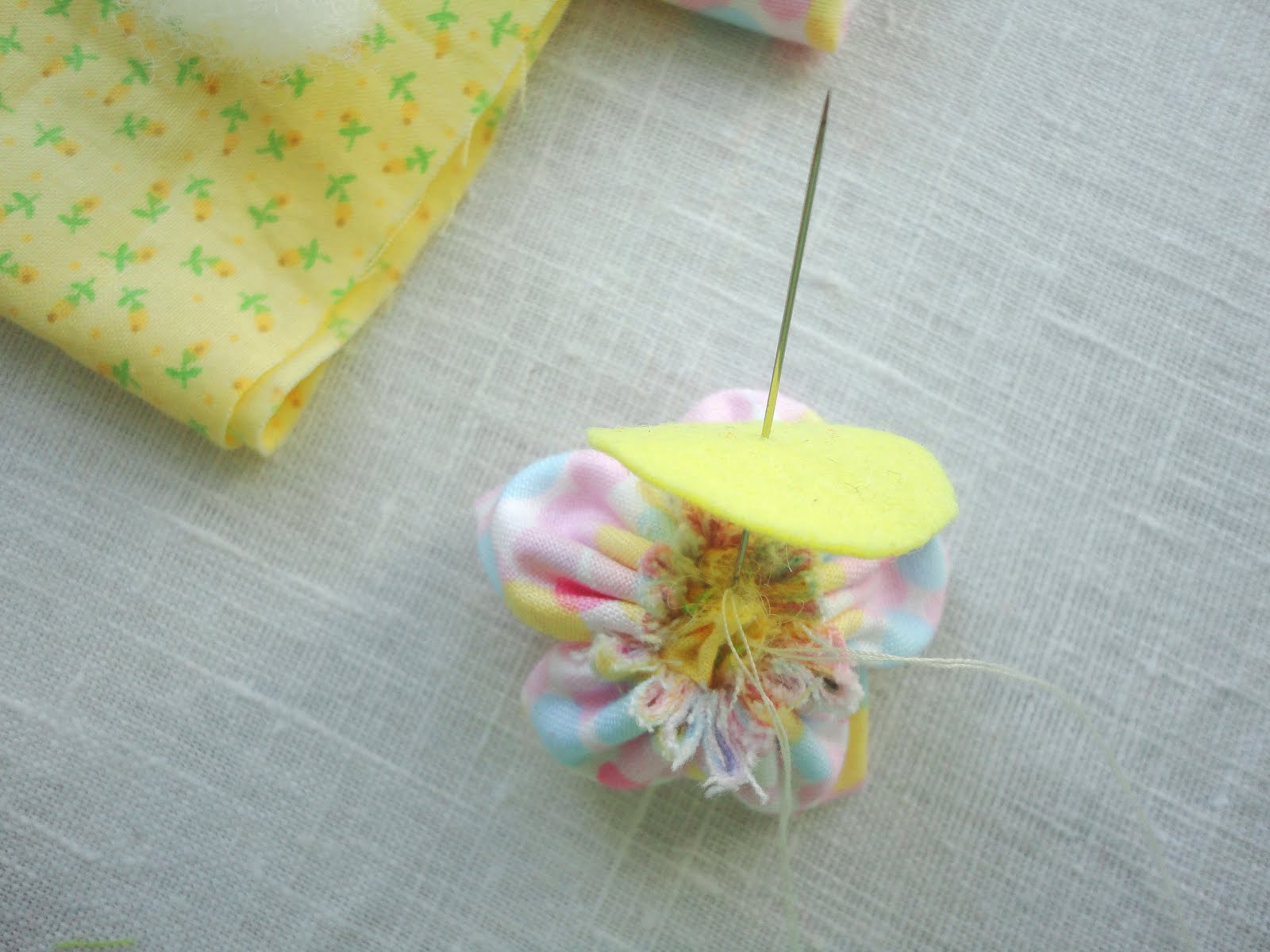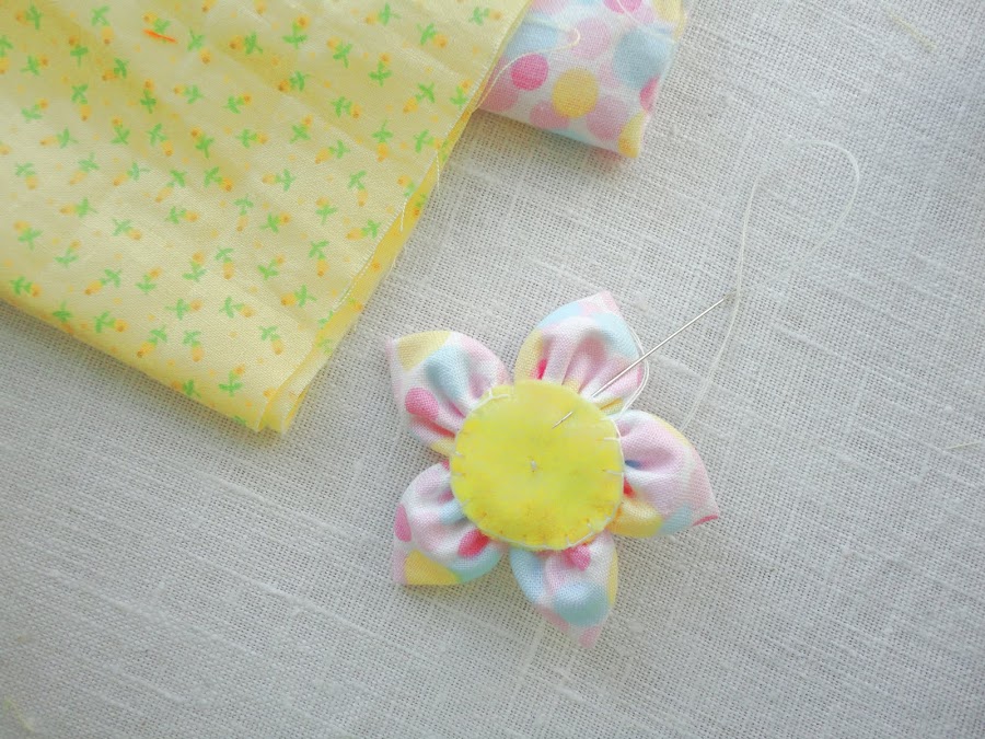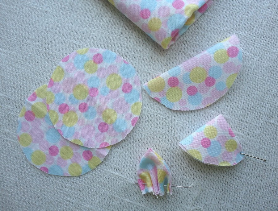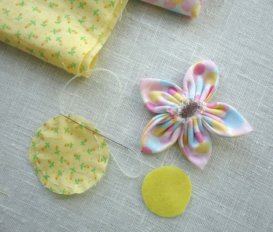 Doblar cada circulo en cuatro para coser cada pétalo de la flor. A medida que vamos cosiendo cada pétalo, los vamos uniendo uno al lado del otro.Cerrar el círculo cuando hallamos completado los cinco pétalos, cosiendo firmemente para que no se suelte.