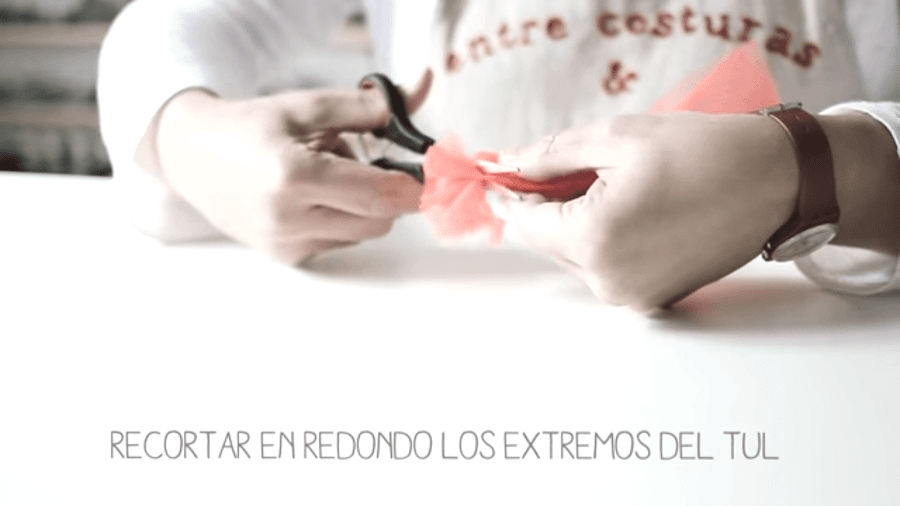 Ahora, recortamos en redondo los extremos de la tela de tul: