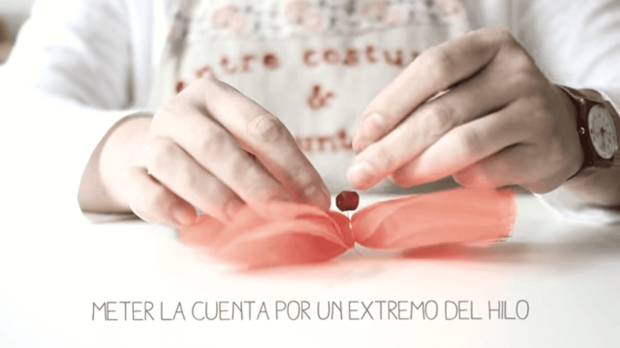 Metemos la cuenta en un extremo del hilo sobrante y volvemos a enrollar el hilo para dejar fijada la cuenta. Después, cortamos lo que sobra de alambre con cuidado de no cortar la tela de tul.