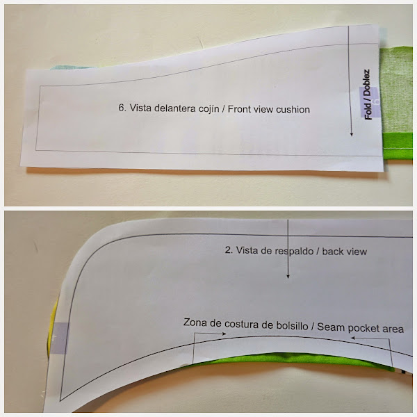 1º Colocamos la pieza trasera, 2º la vista, 3º la parte delantera del cojín y por último la guata