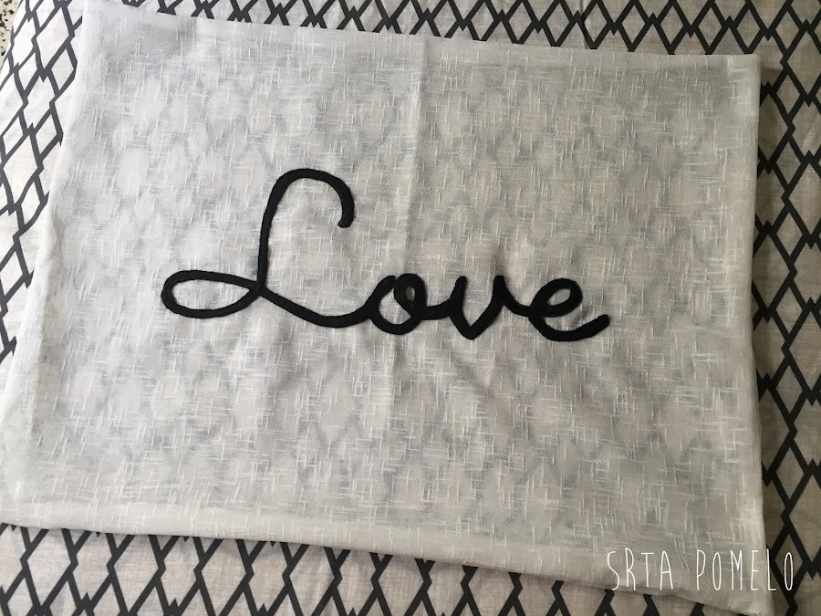 Yo, para el dormitorio de matrimonio he elegido la palabra LOVE, toda una sorpresa para el Sr. Manías. Y lo mejor de todo, he confeccionado la funda utilizando retales y recortes de cortinas que encontré en una bolsa depositada en un contenedor cerca de un taller de tapicería. Ni que decir tiene, que antes de usarlas, las lavé a conciencia a pesar de no haber sido utilizadas.