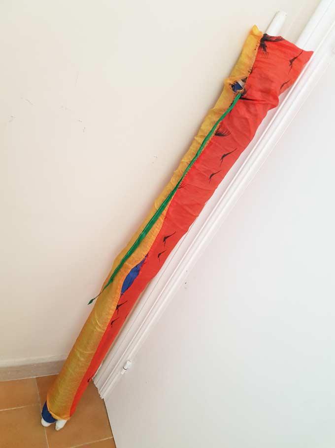 Finalmente realicé un dobladillo en el bajo generando un carril donde he metido una goma de 0,5cm de ancho. La he ajustado bastante para que no se pueda salir la sombrilla, he mantenido esta apertura original que tenia su funda pero si quereís ytambién podéis cerrar esta parte con una costura y dejarla cerrada.