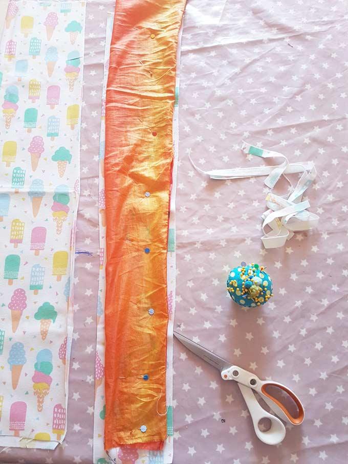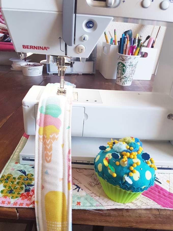Para la confección una vez tenemos el asa montada es ver a que distancia estaba colgada el asa y pasar esas marcas a una de las piezas que hemos cortado de funda (en mi caso corte dos rectángulos), sujeta los extremos del asa con alfielres y cose a 0,5cm para dejarlas sujetas. Luego coloca encima la otra pieza y sujeta de arriba a abajo con alfileres y cose rematando al principio y al final.
