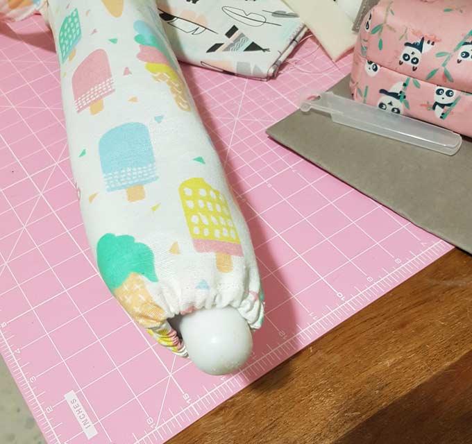 En mi caso en la parte superior he realizado un dobladillo con pespunta y nada más, también podeís meter una goma si os apetece, a mi me ha resultado más cómodo asi para meter y sacar la sombrilla ya que queda bastante bien de tamaño.