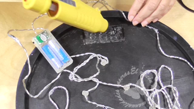 Solo nos queda ir colocando las luces en su lugar por la parte de detrás y las sujetaremos con silicona caliente, pondremos un colgador, en mi caso he reciclado una anilla de refresco y a ver el resultado.