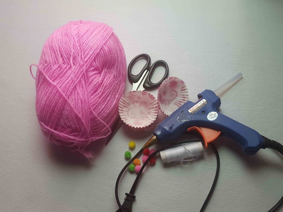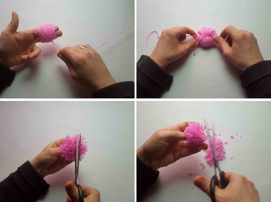 Se hacen los pompones enrollando la lana en dos dedos y dándoles muchas vueltas. Se ata la lana y se corta en los dos lados. Se recorta un poquito para que quede un pompón perfectamente redondo.