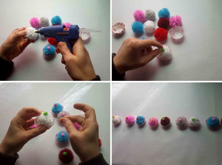 Se pega con silicona el pompón a las blondas y encima se pega un minipompon. Por último se pasa la aguja con el hilo a cada pompón para formar la guirnalda. Puedes optar por no pasarles el hilo y dejarlos individuales si prefieres otra decoración diferente.
