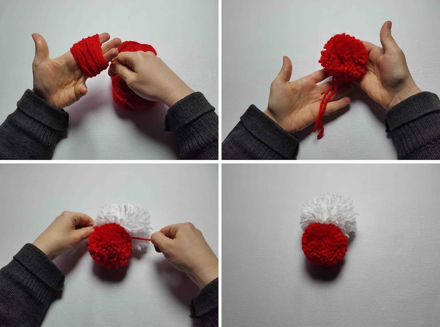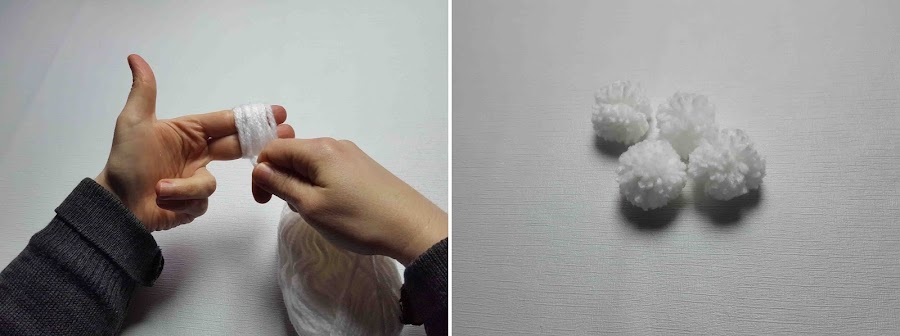Se hacen cuatro pompones más, ésta vez más pequeños usando de medida dos dedos.