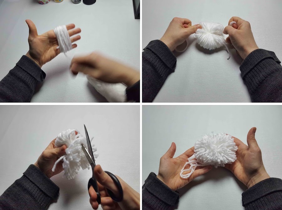 Para la cabeza enrollamos la lana blanca alrededor de cuatro dedos. Para hacer el pompón se necesita lana gruesa y darle muchas vueltas después se quita la lana de la mano y se ata un nudo con otro trozo de lana. Se corta por los lados y se le da forma achatada.