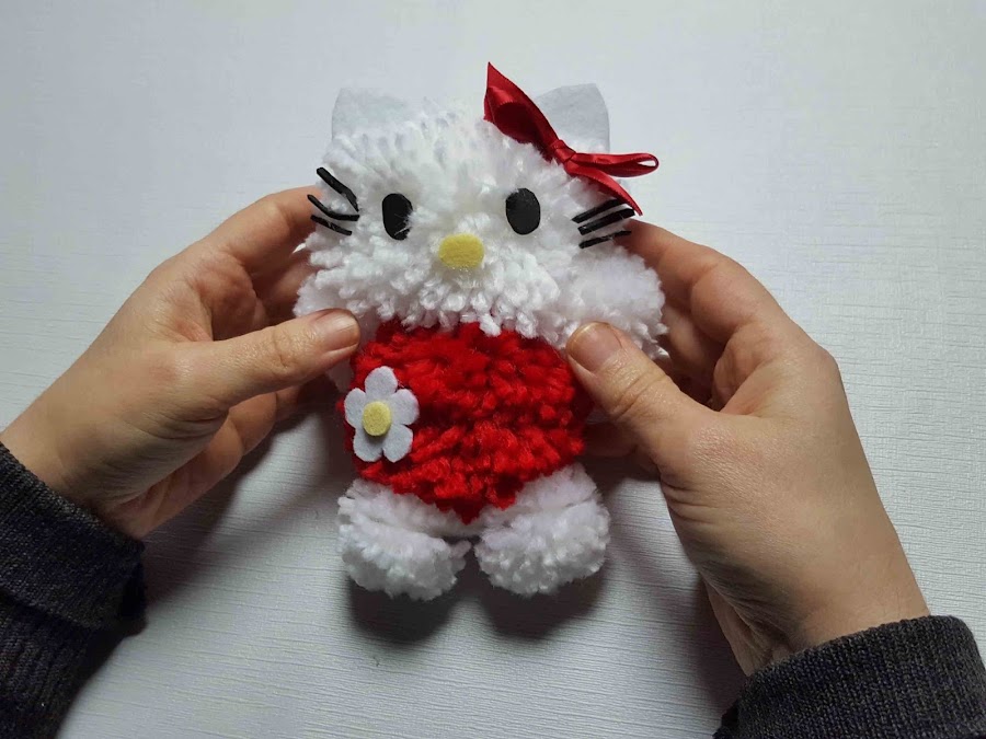Se hace otro pompón para el cuerpo usando tres dedos y se le da forma redonda. Se unen las dos partes.