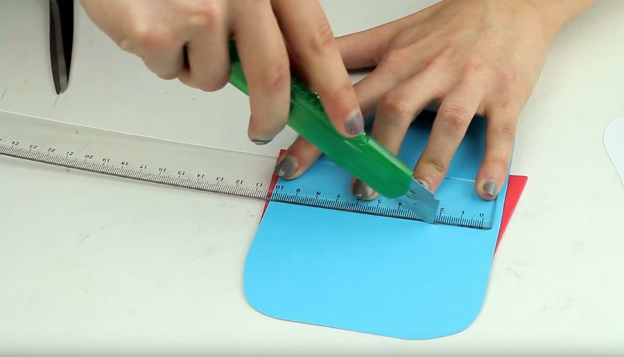 A continuación coloca la parte de cartulina sobre la goma eva y, con ayuda de un cúter, haz dos cortes paralelos. ¡Como una ranura!