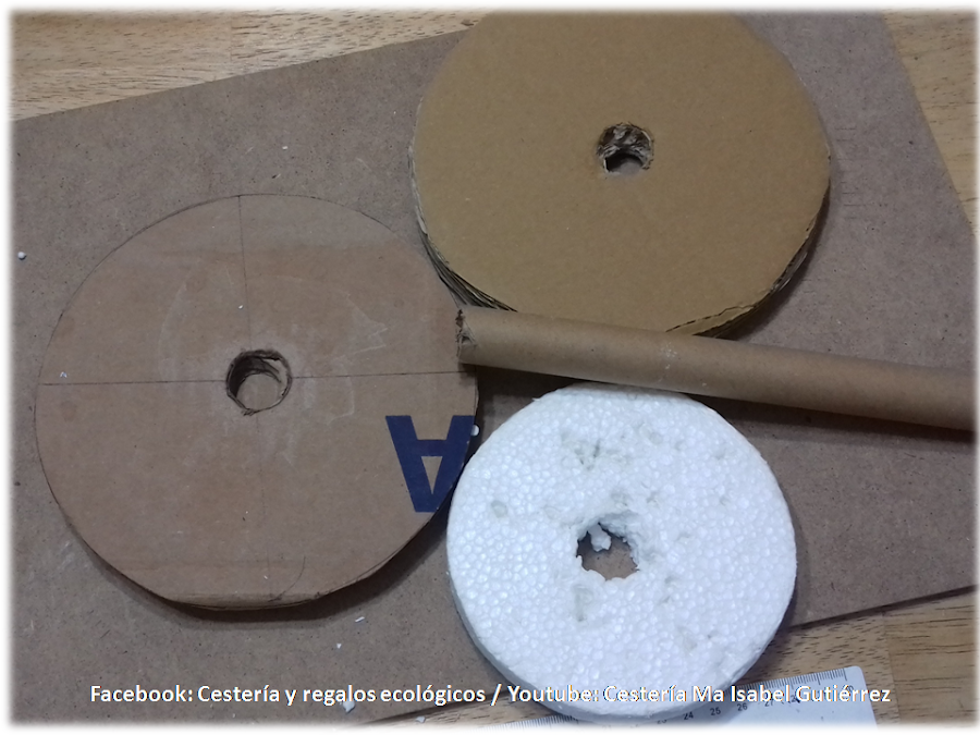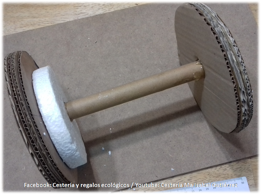 Básicamente se hace con materiales reciclados: cartón grueso y duro, un tubo de cartón delgado, papel y tubos de cartón del papel higiénico...