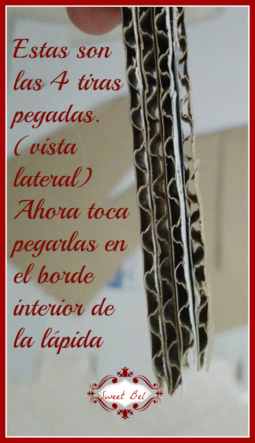Cuando ya tenemos pegado las tirita como veis en la foto (en el borde) cogéis otro trozo de cartón grande, ponéis la lapida que habéis hecho y la copiáis en el cartón. lo recortáis por encima y lo pegáis encima de los trocitos del borde, si lo habéis copiado bien solo tendréis que retocar el corte, para que queden los dos lados iguales. Lo dejaremos secar