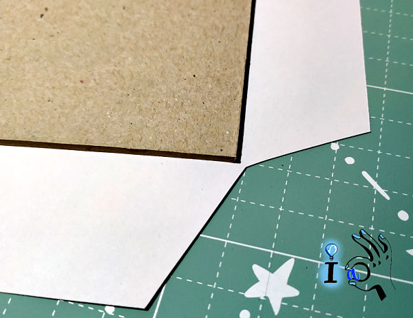 Una vez pegado (y no antes) recortamos las esquinas. Lo hacemos aproximandonos a la esquina del cartón pero sin llegar a ella. Hay que dejar como 1 o 2 milímetros de margen.