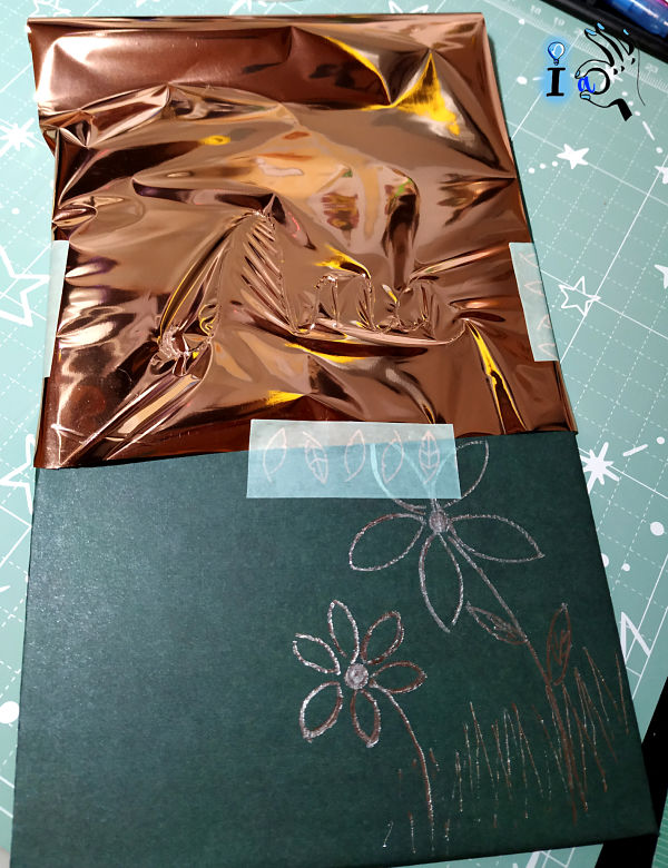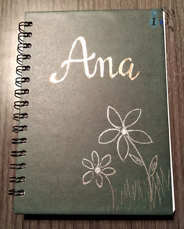 Luego coloqué un foil de otro color para personalizar la libreta con el nombre de la destinataria de la misma (no, en este caso no es para mi). Lo mismo, fijar el foil y luego dibujar.