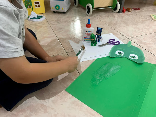 Una vez tengamos el espacio y el material a utilizar, toca inventarse una pequeña historia, a nuestro protagonista, le encanta los PJMASK, por lo que imprimimos la careta de su personaje favorito, Gecko, y comenzamos la actividad.
